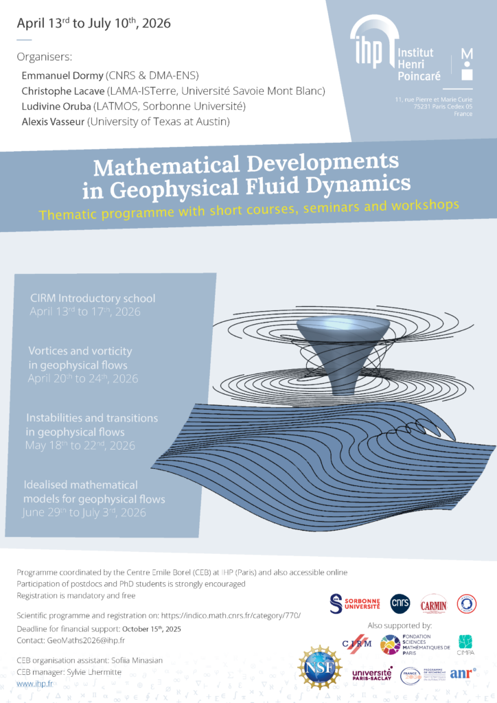 This school will consist of introductory courses on both the study of PDEs in fluid mechanics and the physics of geophysical flows, aimed primarily at M2 and PhD students. The aim of this school is to provide the knowledge required for truly interdisciplinary participation.